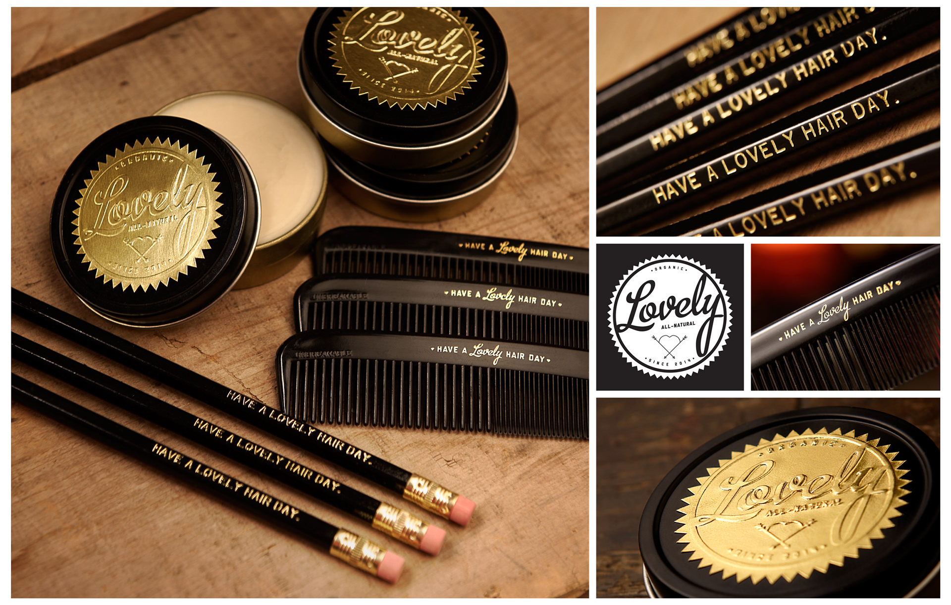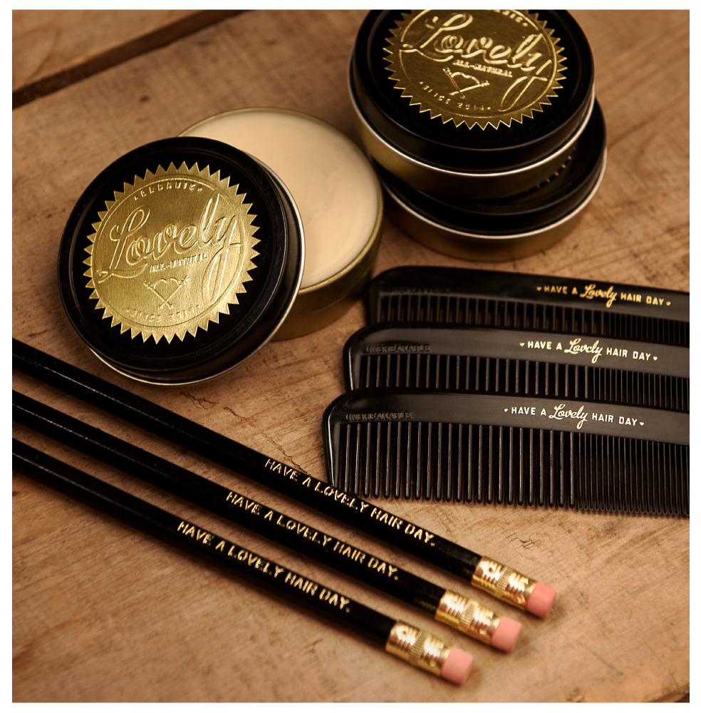 Logo, tagline and packaging for Lovely Hair Wax.`